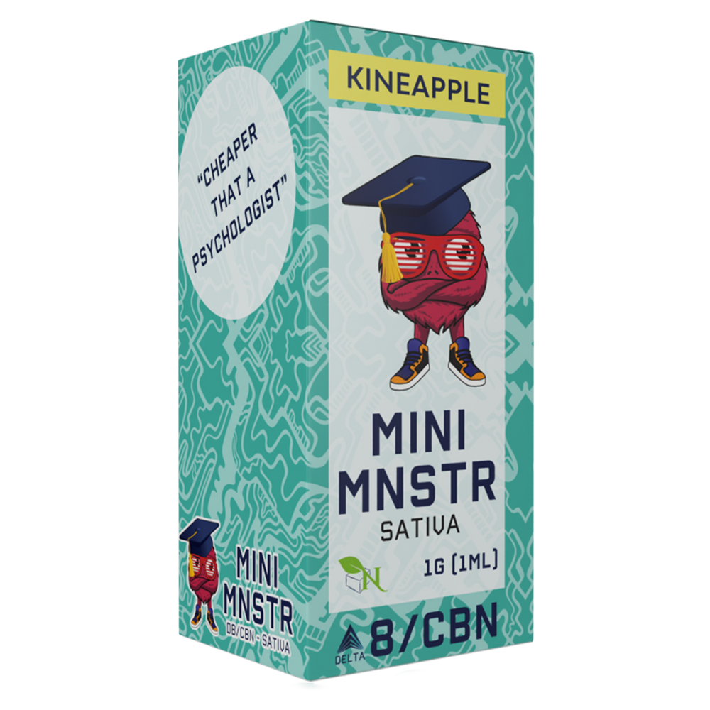 MINI MNSTR DISPOSABLE - KINEAPPLE - D8/CBN - SATIVA - your ultimate all-in-one Delta 8 and CBN disposable vape for the perfect on-the-go experience. Our disposable vape features a carefully crafted combination of Delta 8 and CBN, ensuring you get the best of both worlds. Delta 8 provides all the benefits of hemp-derived cannabinoids without the psychoactive effects, while CBN contributes to a deep relaxation and mood enhancement.